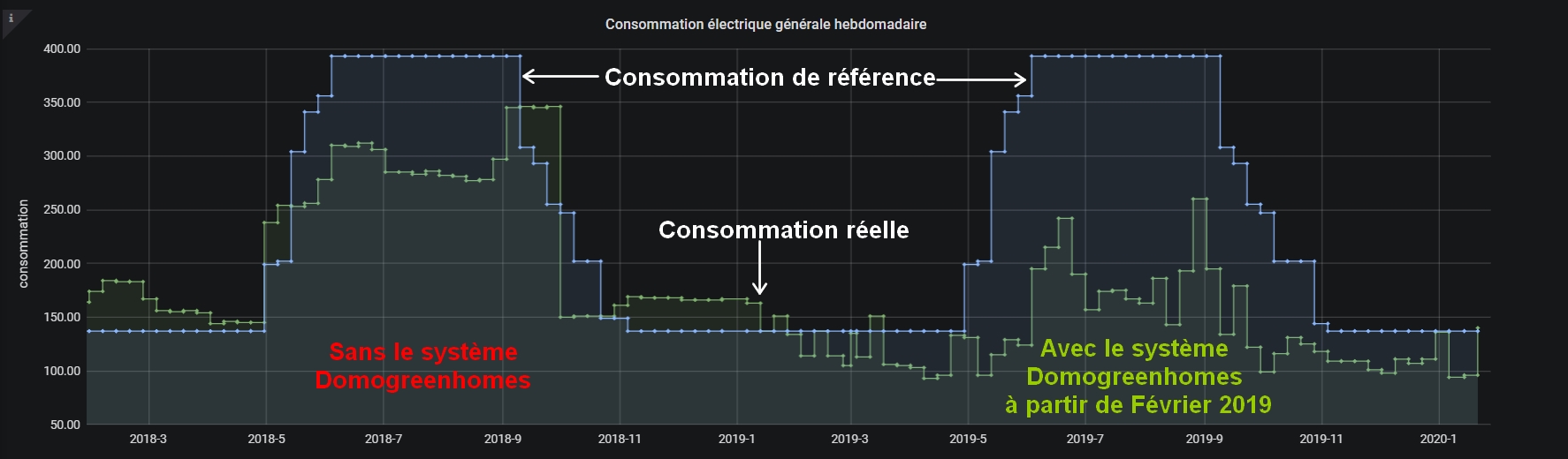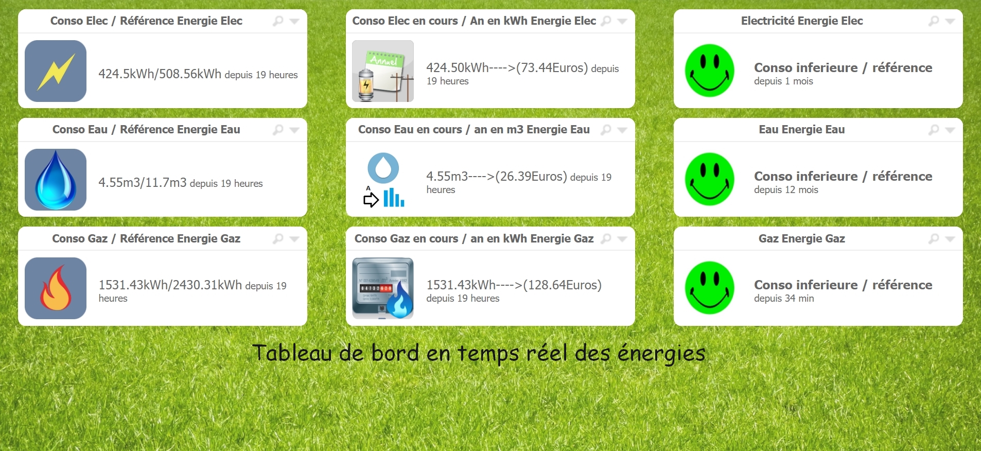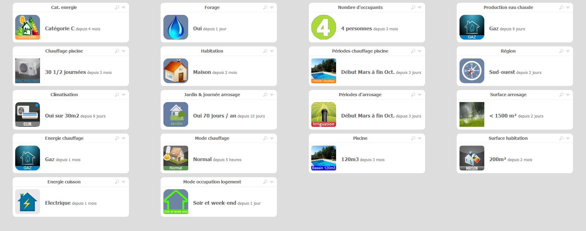 Pour optimiser vos consommations énergétiques , nous avons besoin de critères permettant de simuler vos références pour chacune de vos énergies. Ces références sont les valeurs de chaque énergie que vous devriez dépenser en fonction de vos critères. La plupart du temps nous dépensons plus que nos consommations de référence, notre système (Ecosystème Domotique DomoGreenhomes) est là pour améliorer nos usages et optimiser l’utilisation de nos énergies.